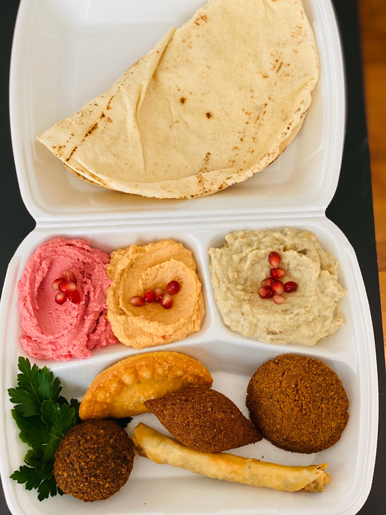 L’assiette se compose de 6 mezzés chauds et/ou froids, avec ou sans viande, y compris 1 galette de pain.